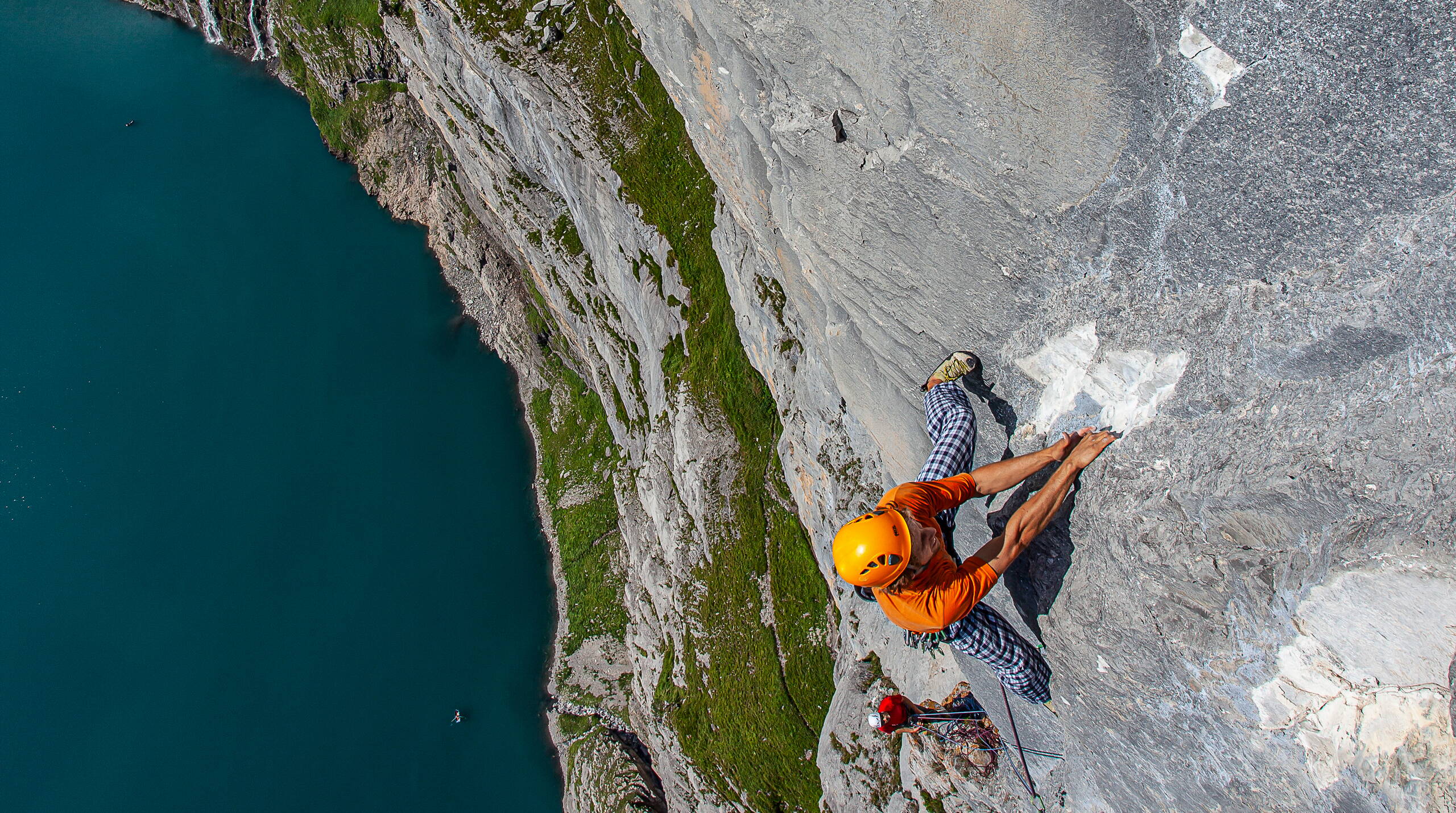 Klettern direkt über dem tiefblauen Oeschinensee: spektakulär! Die Saison startet ab April. Bis Ende Oktober scheint die Sonne ungefähr von 12 bis 18 Uhr (Sommerzeit), später im Jahr liegt die Wand im Schatten.