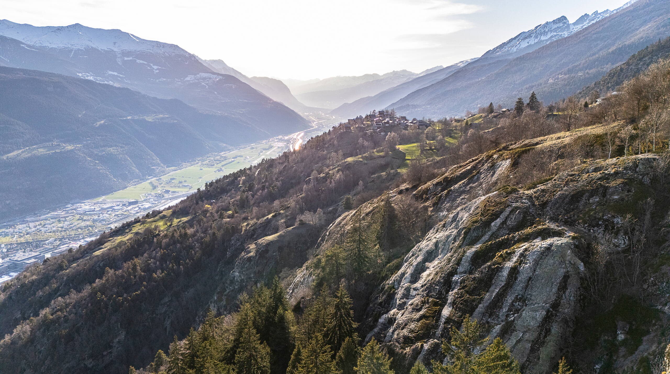 The idyllic hamlet of Finnen is a place with an incredible view high above the valley floor. The 65m Finnen Slab required hours and hours of cleaning and scrubbing the moss away and was then well equipped. The base of the wall lies in the woods, but the higher you climb the more beautiful the views of the highest mountains in Switzerland become. Due to the southern exposure,