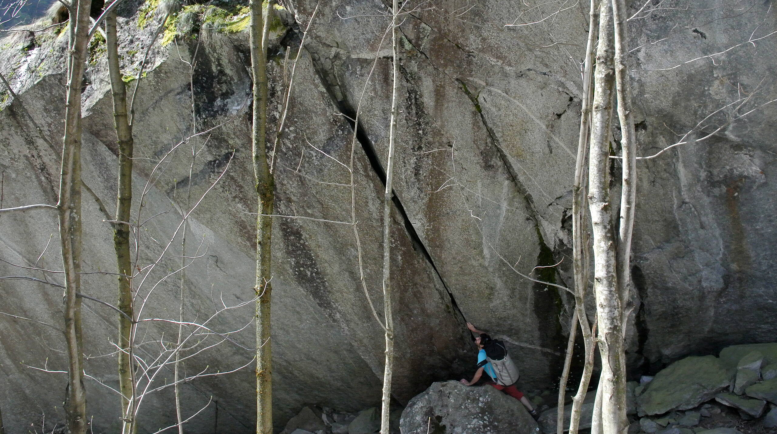 Wer seine Stehtechnik verfeinern und dem Rummel von Ponte Brolla entfliehen will, ist im Val Calnègia genau richtig. Das wunderschöne Hochtal ist ein Paradies für Wanderer und Kletterer. «Splüi» heissen die Behausungen, welche unter riesigen Felsblöcken gebaut und von den Älplern noch bis vor kurzer Zeit benutzt worden sind. Um in Calnègia vom Boden abzuheben, sollte jedoch bereits eine gewisse Stehtechnik vorhanden sein, denn wenn der Tessiner Platten-Spezialist Glauco Cugini Hand anlegt, wirds häufig sehr trittarm... Auf den glatten Platten findet man ab und zu auch etwas für die Hände. Quarzadern sowie einige Risse und Verschneidungen sorgen für Abwechslung und die übersäuerten Waden können sich etwas erholen...