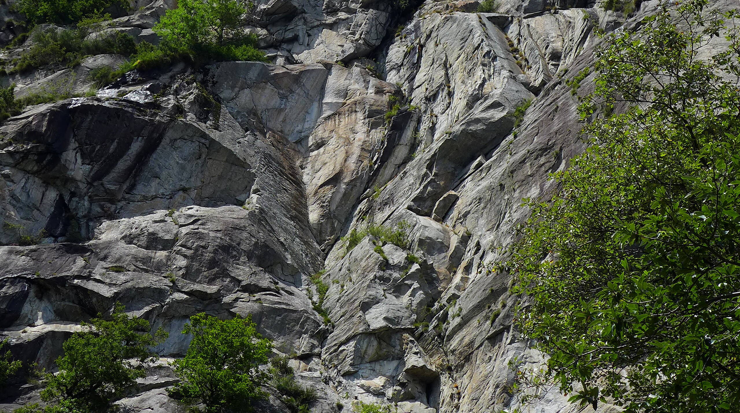 The South Face of the Parete ai Monti above Berzona is divided into two parts. The first is smooth and slabby. The second looms above with its steep headwall. “Dimitri” has crack, corner, and arete climbing. Expect some exposure and lots of variety. Besides clipping bolts, you definitely need to carry Camalots to supplement protection in the cracks and dihedrals.
