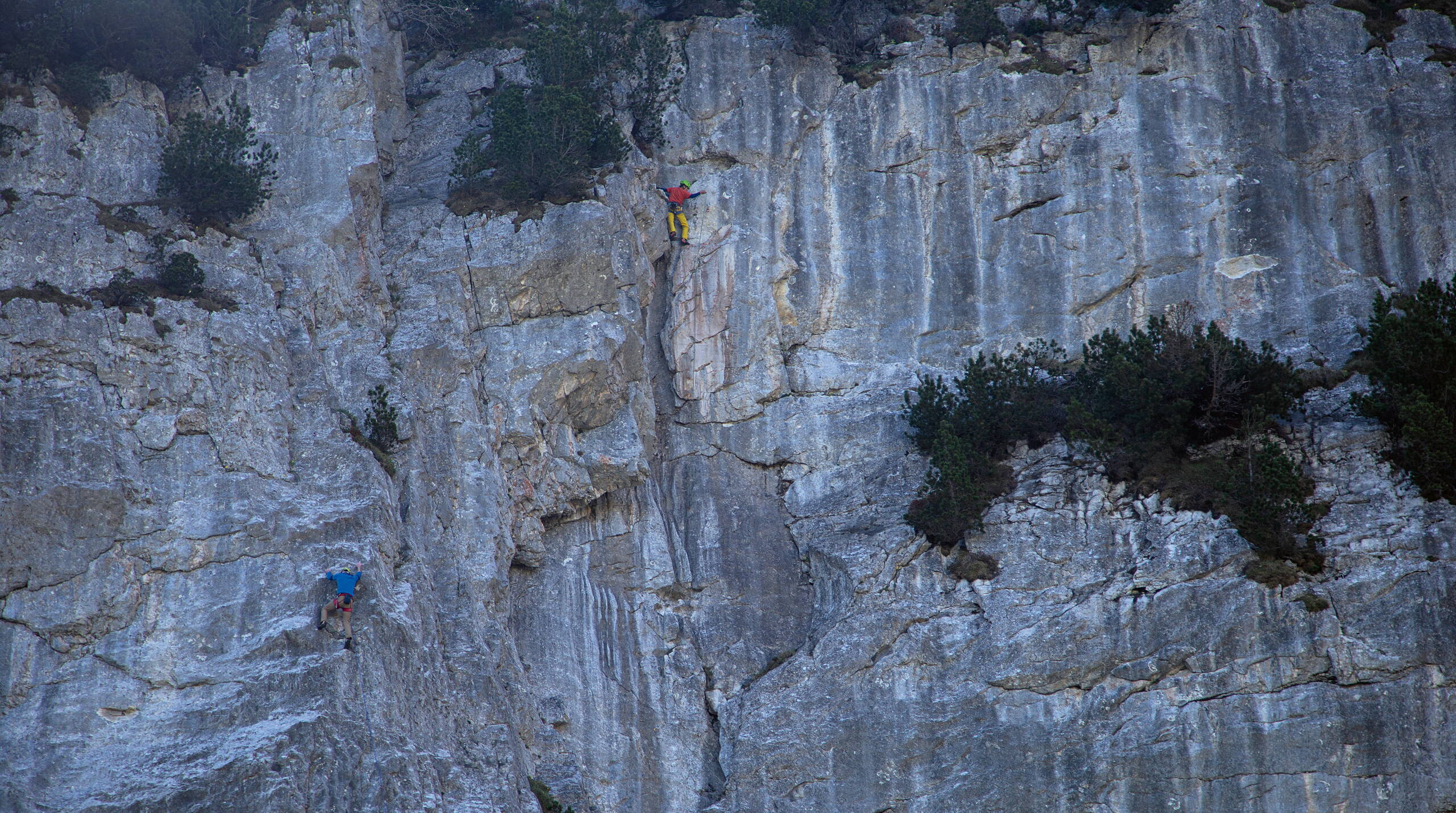 Ascher is without question, one of the most beautiful and popular climbing areas in Alpstein. The cliff spans for 1.5km with a large number and a wide variety of routes from 1 to 5 pitches in length. The majority are single pitch sport climbs. The 6c – 7b climber has a plethora of routes to choose from here. What makes this a great place to climb are the numerous routes, the quality rock, the beautiful location, and the easy access. In the Fall, when the valley is often covered by a thick layer of fog, you’ll find the best climbing weather. But you can climb here even in winter.
