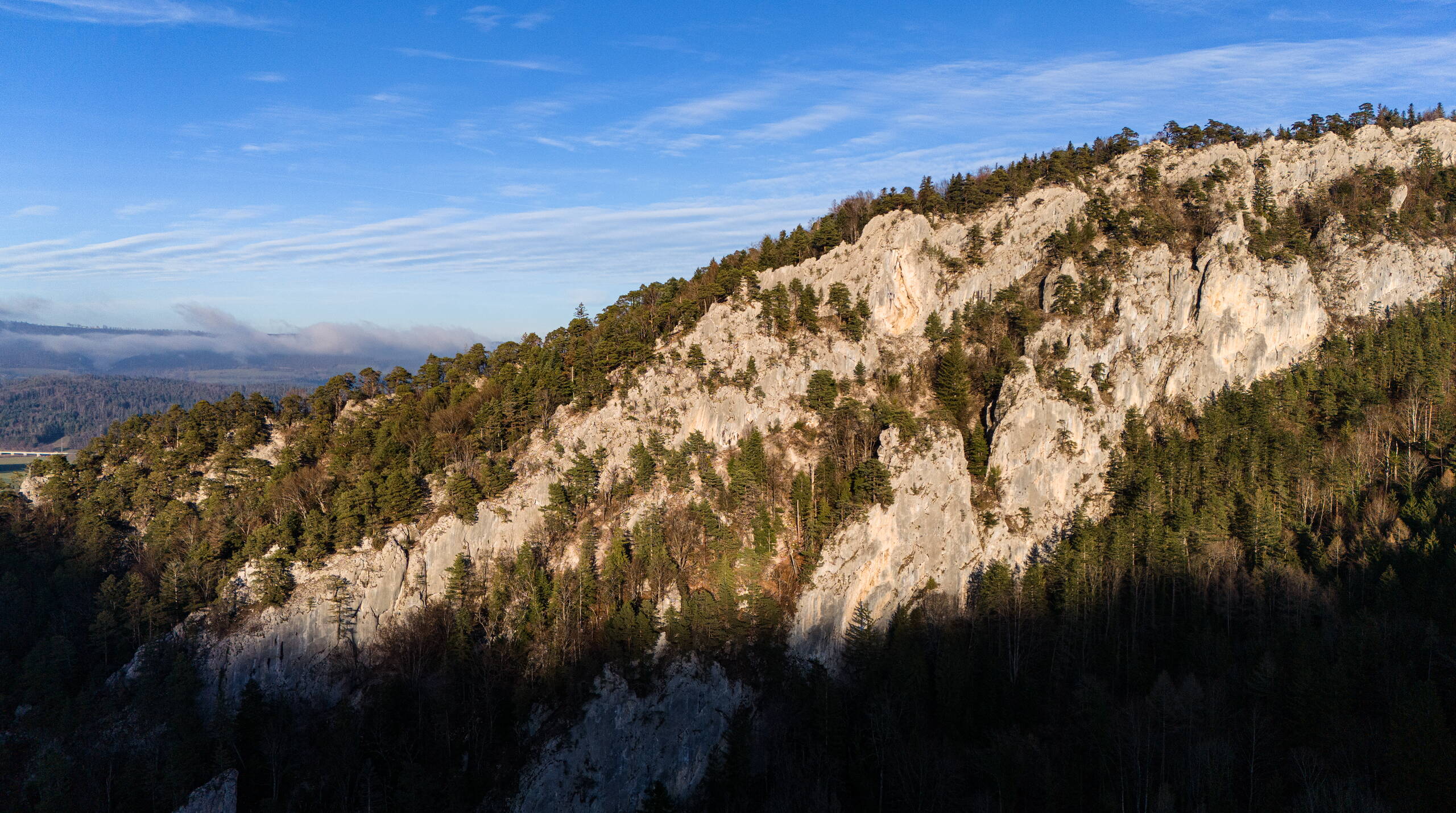 quality Jura limestone. Since 2009 the passionate developer Yan Blanchard put up countless routes and established approach trails for the area. A refined foot techniqueand strong fingers are key to sending. Between 2019 and 2023 Michel Brechet developed the “Grands Crus” Sector. The routes are long and varied. The rock is grippy, but in places unstable. Helmets are recomended! The landings are often steep and slopey. The only exception are the flat landings found in the “Marco”